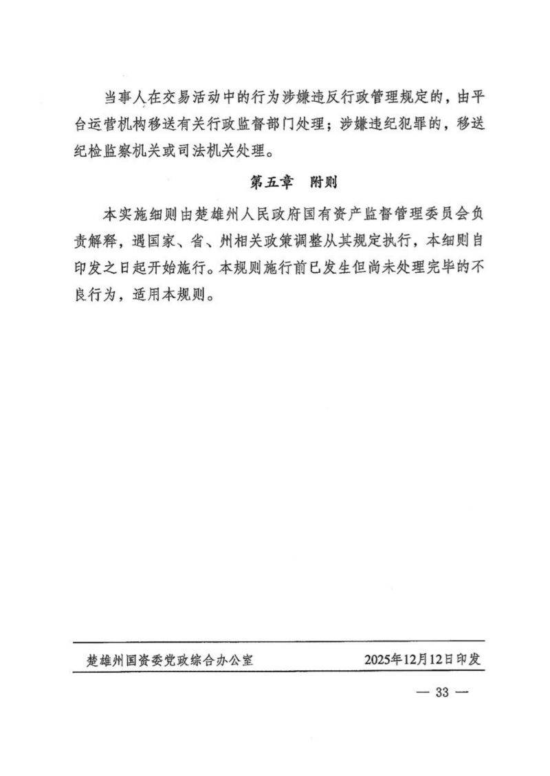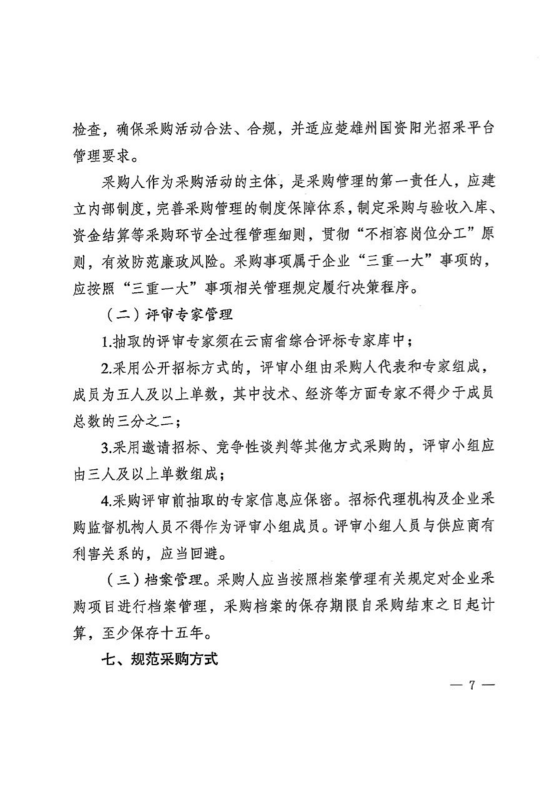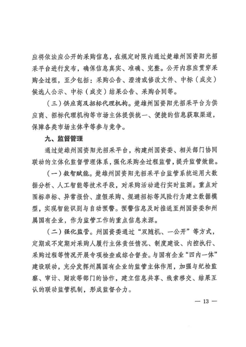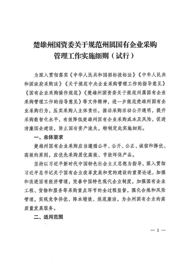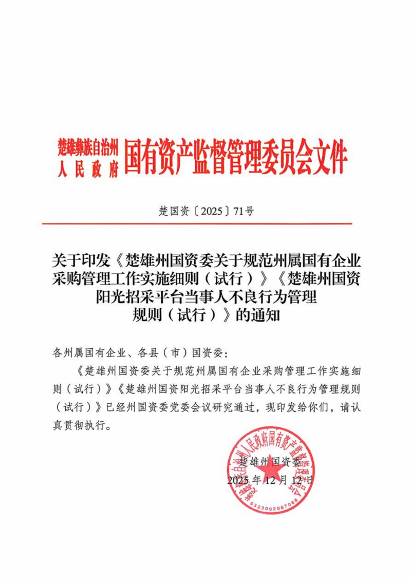 楚国资〔2025〕71号关于印发《楚雄州国资委关于规范州属国有企业采购管理工作实施细则(试行)》《楚雄州国资阳光招采平台当事人不良行为管理规则(试行)》的通知